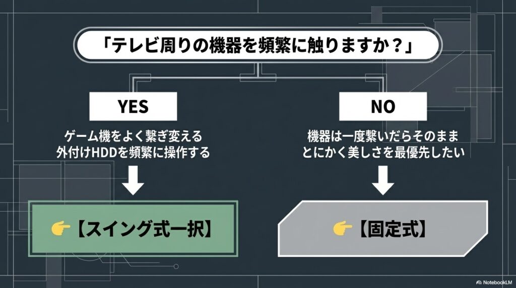 特にゲーム機や外付けHDDを頻繁に繋ぎ変える方は、配線のしやすさから「スイング一択」と言えます。 - 75インチ以上: