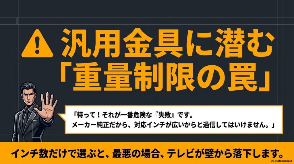 最近の大型テレビは非常に重量があるため、耐荷重を超えた金具を使うと、