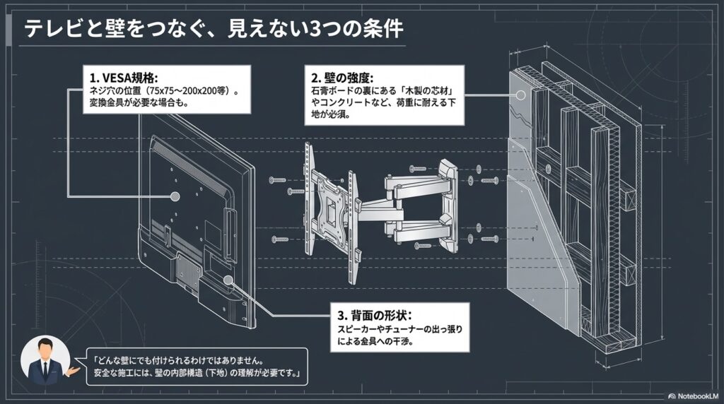 「さらに専門的な話をすると、テレビの背面にあるネジ穴の規格(VESA規格)が