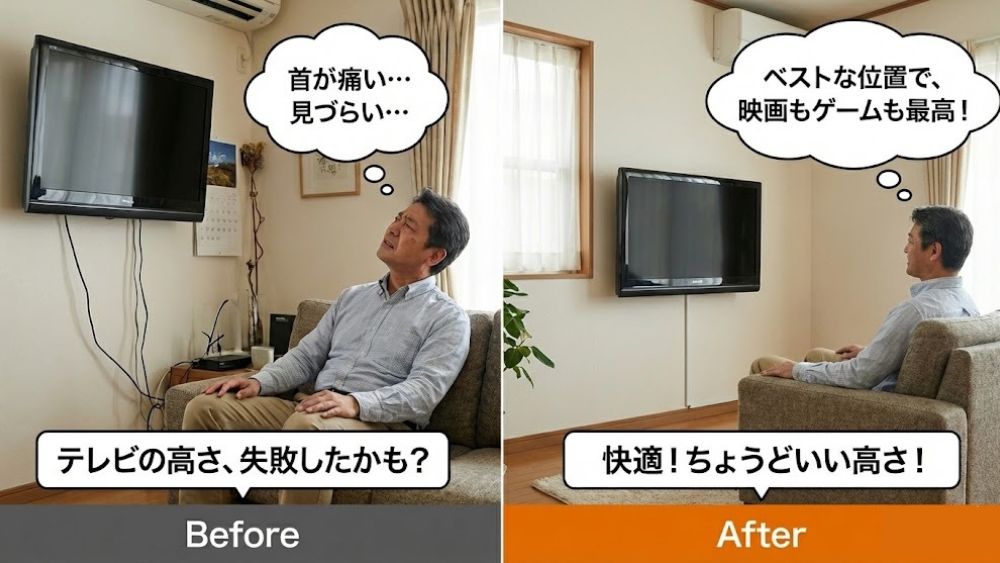 パパはソファが好きでも、子供たちは床が好きなら、低い方に合わせるのがセオリーです。なぜなら、「見下ろす」のは楽でも、「見上げる」のは辛いから。「大は小を兼ねる」けど、「高は低を兼ねない」のが壁掛けテレビの鉄則です。