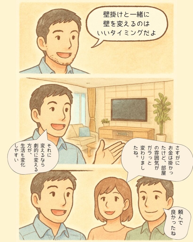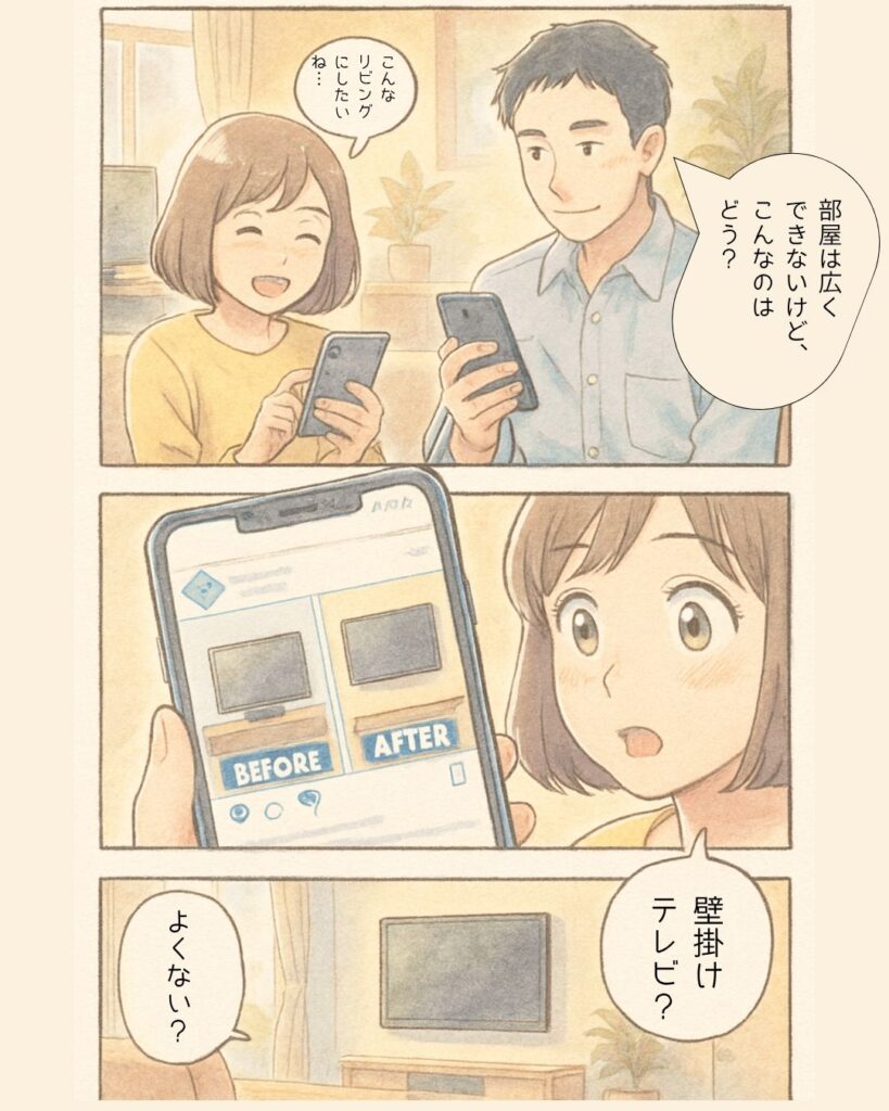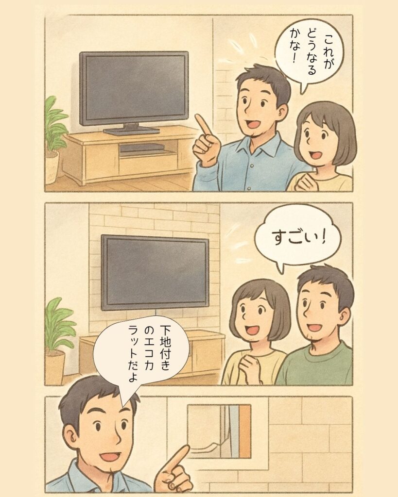「壁掛けテレビにするなら、一緒にエコカラットも施工したいんです!」 そう、今やテレビはただ「見る」だけでなく、壁ごと美しく「飾る」時代。 今回は、なぜこの組み合わせが最強なのか、そして、そこに潜むプロだけが知る注意点を、漫画と一緒にお伝えします!