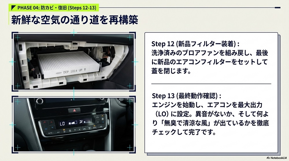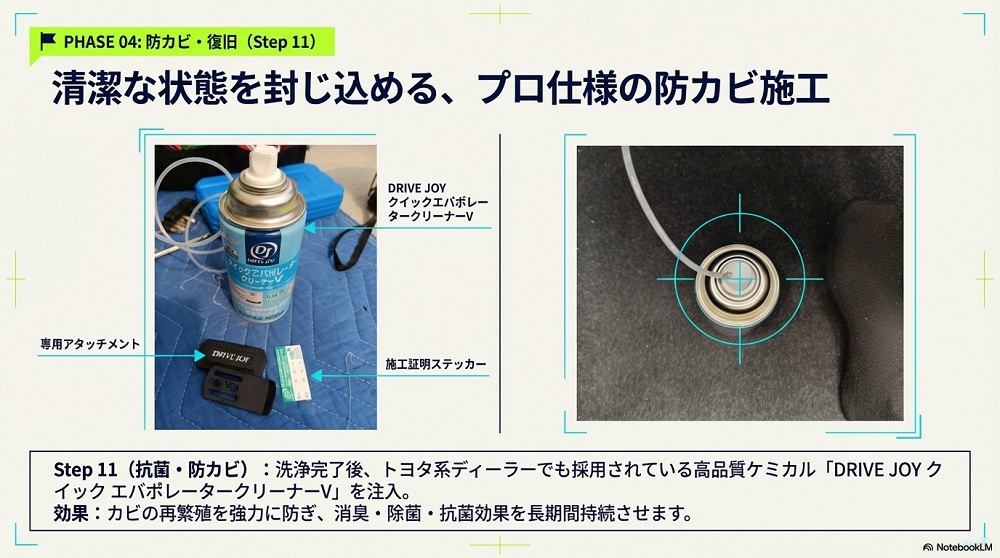 ガスが抜けたら外気循環に切り替え、ACクーラーモードで内部をコーティングし、カビの再繁殖を強力に防ぎます 。