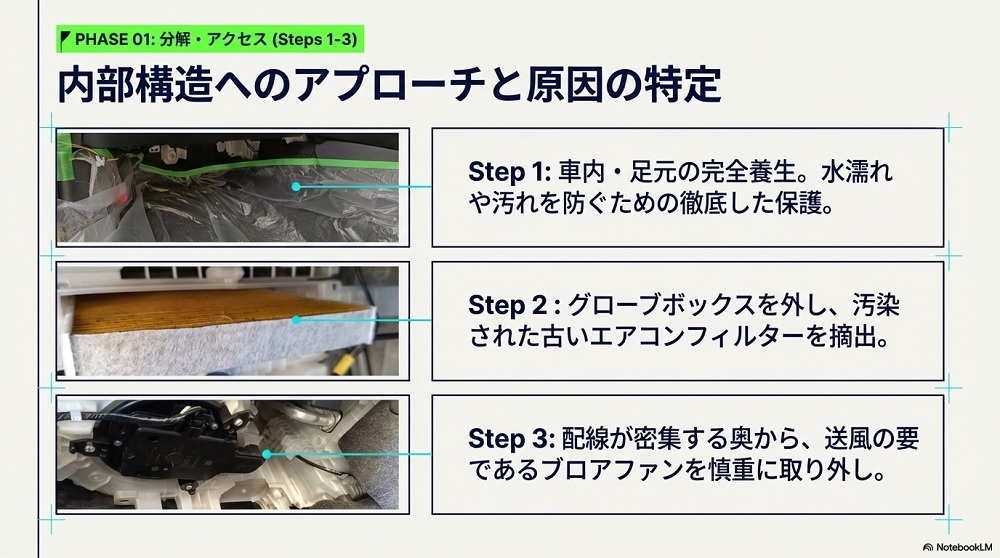まずはエアコンの心臓部へアクセスするため、グローブボックスを外し、汚染された古いエアコンフィルターを摘出します 。