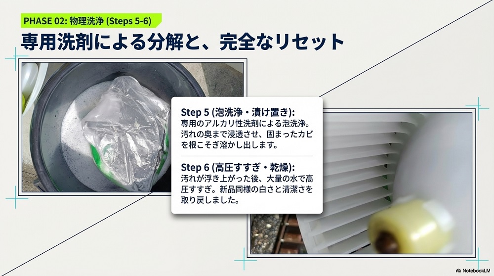 この時、作業中に撮影した内視鏡カメラの画像や洗浄工程の写真をお見せしながら、どのように汚れを落としたかを
