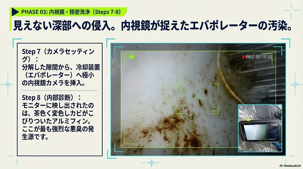 一見するとそこまで汚れているようには見えない、けど実は専用の内視鏡カメラでエアコンの