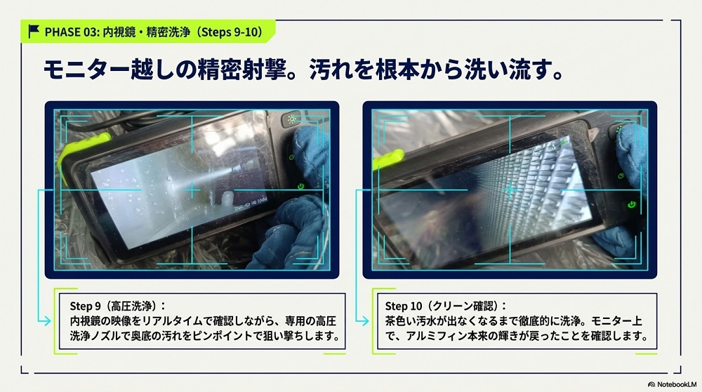 高圧洗浄機のフレキシブルノズルに内視鏡カメラを装着し、モニターで汚れを確認しながらエバポレーターを