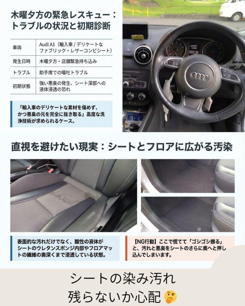 【緊急SOS】木曜夕方に駆け込んだアウディA1。お出かけ前の「嘔吐トラブル」を即日リセットした物語