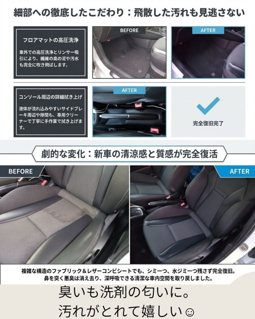 ただ1席を洗うだけでなく、車内全体が「お出かけしたくなる空間」へと生まれ変わる、隠れた人気プランだ。