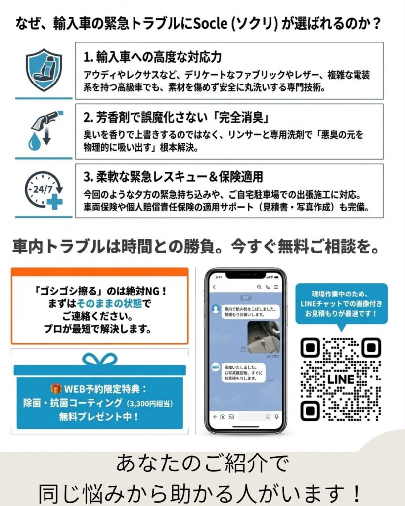 密閉された車内での嘔吐トラブルは、自分で必死に拭いても嫌なニオイが消えず、罪悪感やパニックに