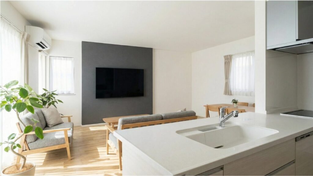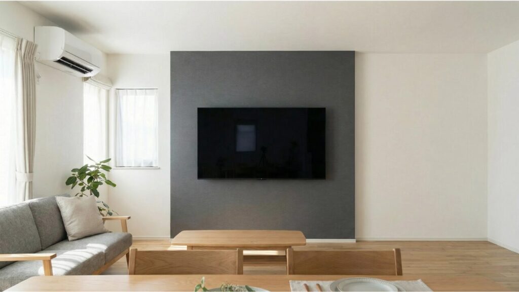 以前はテレビから垂れ下がっていた配線は跡形もなく消え、ダークグレーのアクセントクロスが施されたふかし壁に、