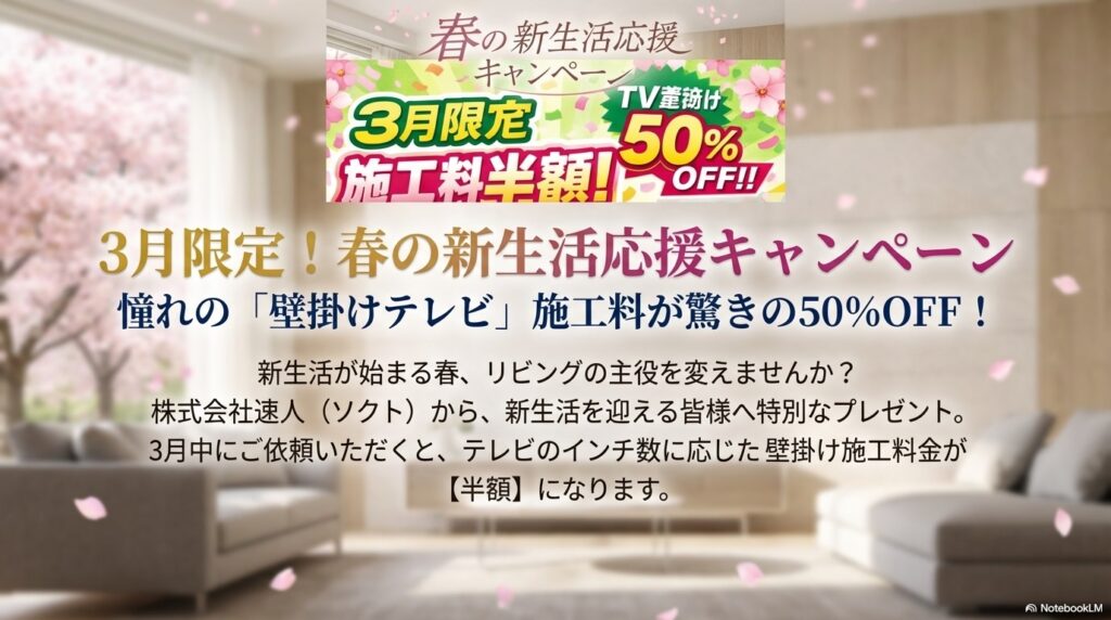 こんにちは🕊️🌿名古屋市北区で壁掛けテレビと壁の施工専門店「Socle/ソクリ」壁のコンシェルジュ坂井です。壁掛けテレビに関する事はなんでも、お気軽にご相談くださいませ!今回は『3月の新生活応援キャンペーン』のお知らせです! ずっと気になったけど... -